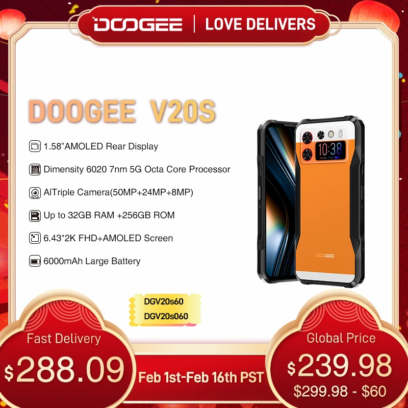 DOOGEE V20S Rugged Phone Dimensity 6020 5G Octa Core 1.58″ AMOLED Rear Display 12GB+256GB Leather Texture With Kickstand Phone