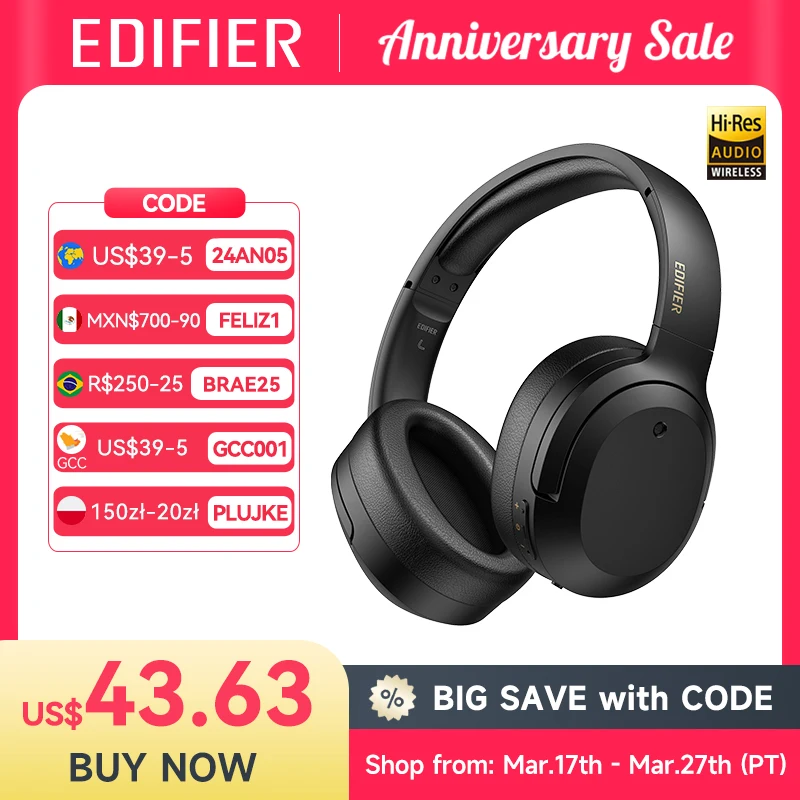 Edifier W820NB Plus Wireless Noise Cancelling Headphones 43dB ANC Hi-Res LDAC Codec 49hrs Playtime Over-Ear Bluetooth Headset