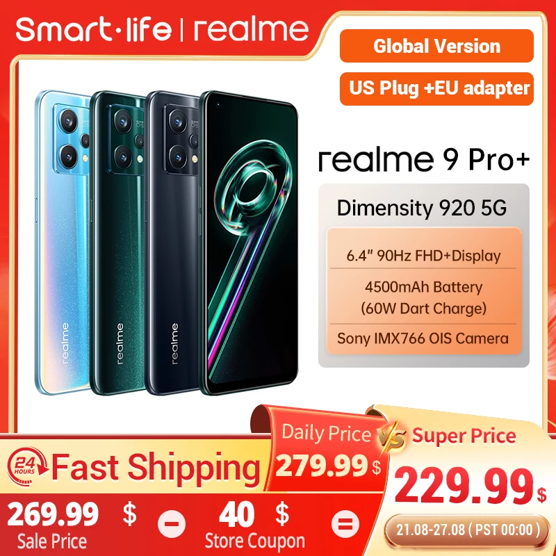 Global Version Realme 9 Pro Plus 5G Dimensity 920 Sony Imx766 Ois Camera 60w Superdart Amoled Display (US Plug+Adapter)