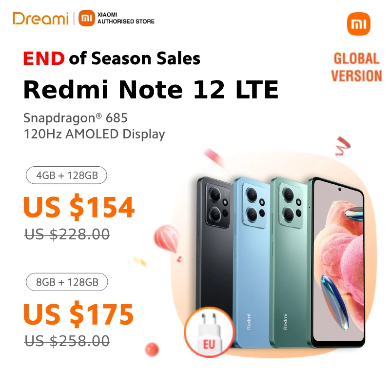 Global Version Xiaomi Redmi Note 12 LTE – Snapdragon 685, Dual SIM, 120Hz AMOLED, 5000mAh Battery, IP53 Water Resistance, Sealed