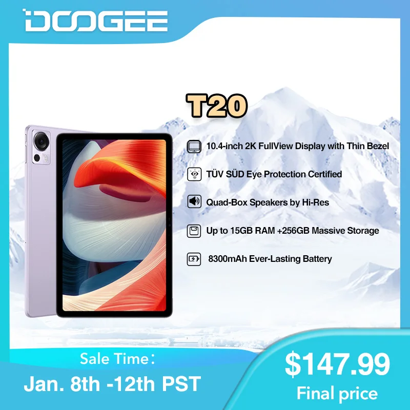 New DOOGEE T20 Tablet 10.4″ 2K TÜV Certified Display 8GB+256GB Octa Core Widevine L1 Four Hi-Res Speakers 8300mAh Pink Purple