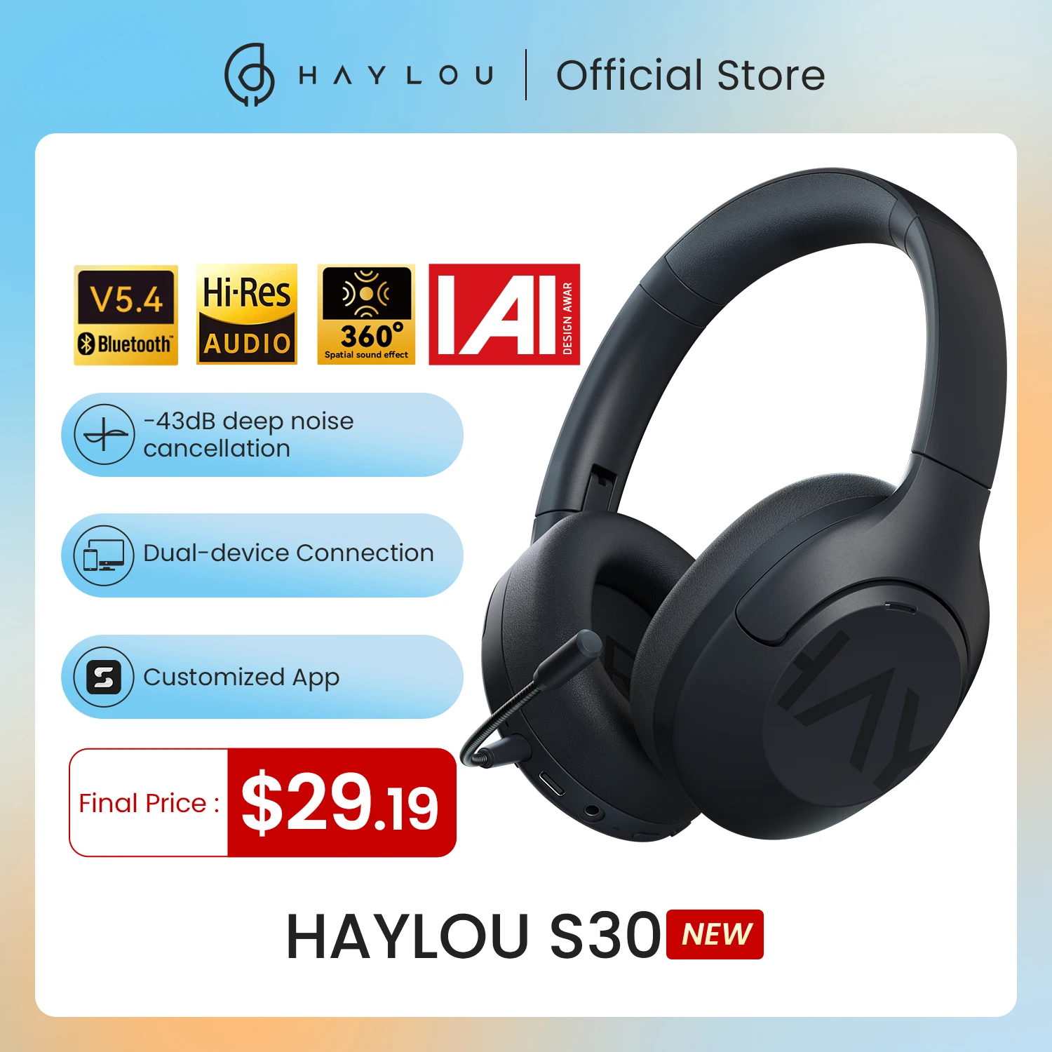 HAYLOU S30 Wireless Bluetooth 5.4 Headphones With Mic Noise Cancelling Headsets Hi-Res Audio 43dB Active 40mm Driver Earphones