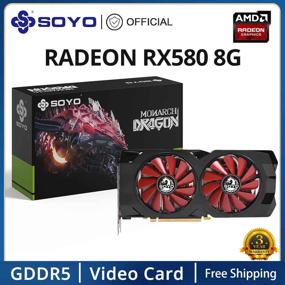 SOYO Full New AMD Radeon RX580 8G Graphics Card GDDR5 Memory Video Gaming Card PCIE3.0x16 HDMI DP*3 for Desktop Computer