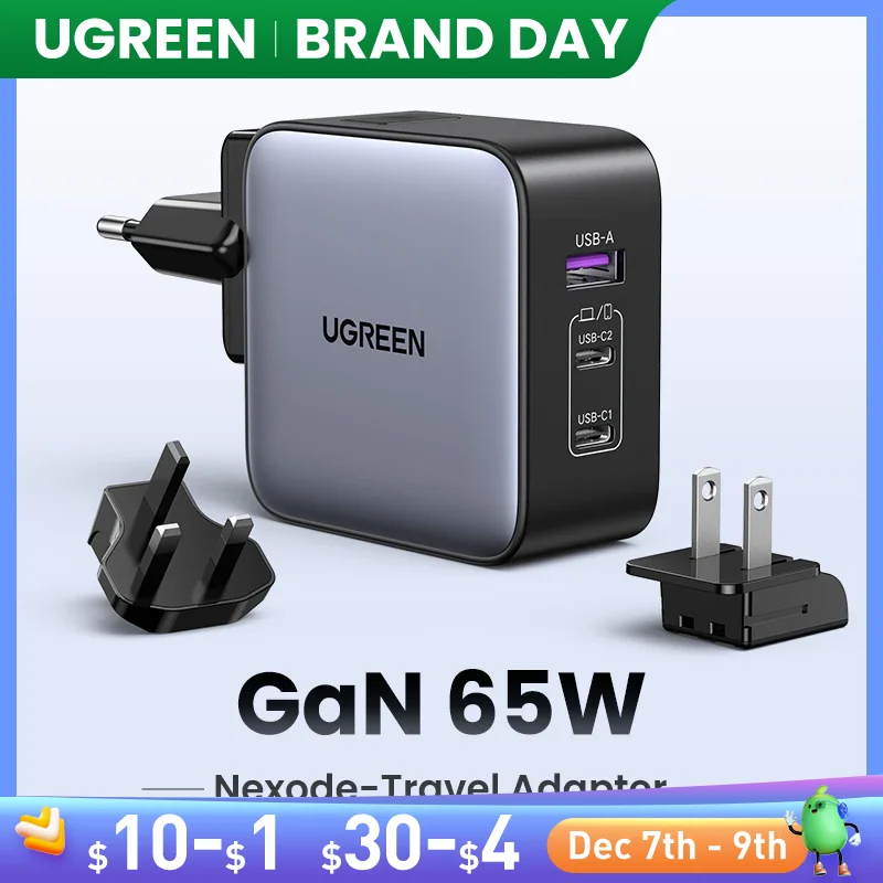 UGREEN GaN 65W Travel Adapter All-in-one Travel Charger with 1 USB Ports and 2 Type C Wall Charger for US EU UK Travel