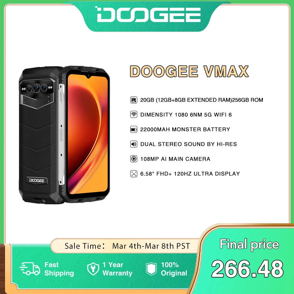 World Premiere DOOGEE V Max 5G Rugged Phone 22000mAh 12GB+256GB Cellphone 108MP Camera Phone 120Hz Dimensity 1080 Hi-Res